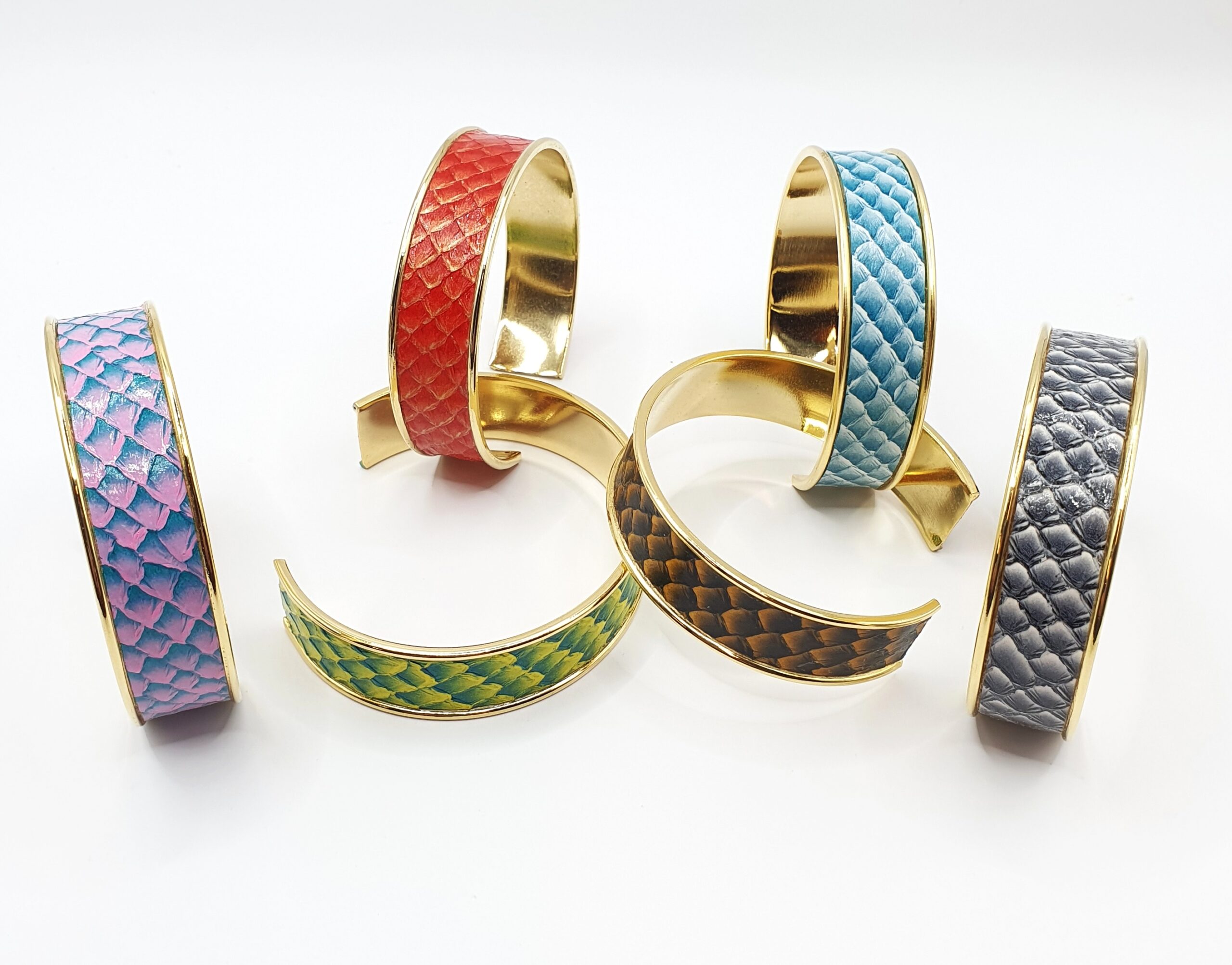 Aucun cuir de poisson ne se ressemble : Emplacement « d’écailles » plus ou moins grand, la teinte peut aussi légèrement varier d’un cuir à l’autre. De ce fait chaque bijou est unique !